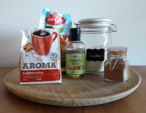 Ik koos voor een suikerscrub van twee soorten suiker met koffie en kaneel. De geur past goed bij de herfst en koffie kan helpen tegen cellulite. Voor deze scrub heb ik amandelolie gebruikt maar je kunt eigenlijk elke olie gebruiken. Olijfolie is bijvoorbeeld heel geschikt om scrub te maken. Vind je de geur van olijfolie niet fijn op je huid? Gebruik dan bijvoorbeeld zonnebloemolie.