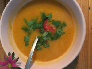 Serveer met koriander en klein gesneden stukjes zoete peper.