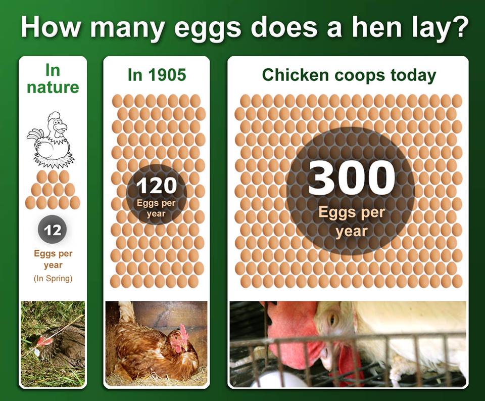 De leghennen die vandaag de dag leven, zijn afstammelingen bankivahoen (Gallus gallus). Voordat deze vogel duizenden jaren geleden gedomesticeerd werd, legde de bankivahoen rond de 6 eieren per jaar. Net als de meeste andere soorten vogels legden bankivahoenen alleen een paar eieren in de lente en de rest van het jaar niet. Door duizenden jaren van gericht fokken leggen hennen tegenwoordig veel meer eieren en het hele jaar door. Sommige hennen kunnen wel 300 eieren per jaar leggen. De laatste decennia is de productiviteit van leghennen nog verder verbeterd met behulp van kunstmatige inseminatie, waardoor nog sneller nieuwe leghennen gefokt kunnen worden. Daarnaast wordt tegenwoordig de omgeving van de kip gemanipuleerd zodat ze nóg meer eieren leggen. Het licht kan bijvoorbeeld zo afgesteld worden dat kippen het hele jaar door denken dat het broedseizoen is.