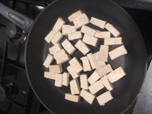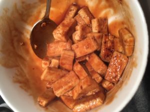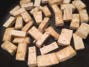 Tip 1: Bak de gesneden stukjes tofu eerst met een beetje zout en peper tot ze aan beide kanten lichtbruin zijn. Daarna bestrijk je ze met de marinade en bak je ze aan beide kanten tot de stukjes knapperig zijn.