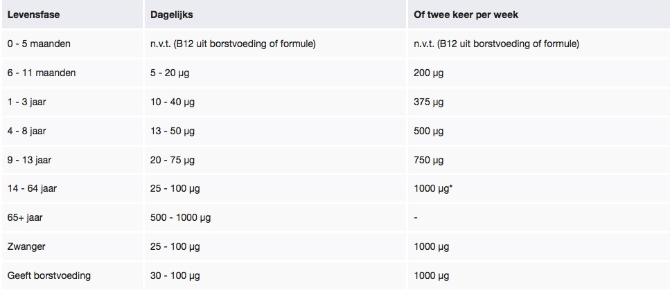 Op de website van de Nederlandse Vereniging voor Veganisme valt te lezen dat je vanaf je 14e levensjaar zo’n 2,8 mcg B12 per dag nodig hebt, dat geldt zowel voor mannen als voor vrouwen. Zwangere vrouwen hebben zo’n 3,2 mcg per dag nodig. Vrouwen die borstvoeding geven zelfs 3,8 mcg per dag. Tekorten ontstaan gemakkelijk terwijl het niet schadelijk is om te veel vitamine B12 binnen te krijgen.